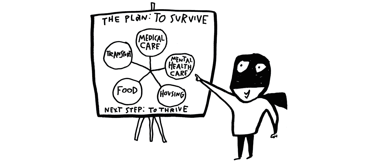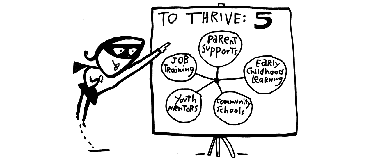 Imagine a future when 100% of us can access vital services in times both calm and chaotic. We call these services that none of us can do without “surviving services,” which start with medical care and include behavioral health care, safe housing, secure food and transport to vital services. Now imagine everyone can access what we call “thriving services,” which include: parent supports, early childhood learning programs, fully-resourced community schools, youth mentors and job training.