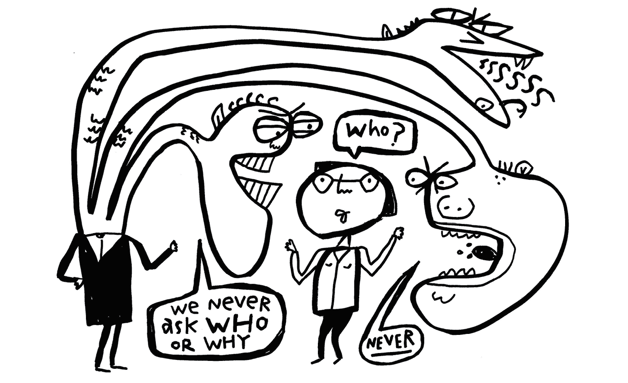 The three heads work collectively and do their best to keep society rolling and the humans doing their jobs, spending money and accepting orders without question. At any encounter with a hydra, listening to three heads spinning tales of half-truths and outright lies, one always leaves disoriented, disempowered and destabilized. Hydra-form is also contagious. Spend too much time around them, and you might turn into one yourself.